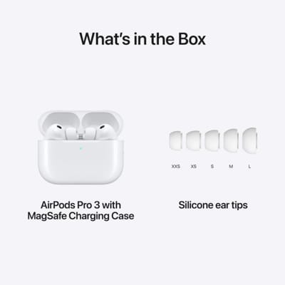 New ultra-low-noise microphones. Using advanced computational audio to remove more noise around you than ever, AirPods Pro 3 let you zone in (or out) when you need to. And five all-new ear tips — including an XXS option — fuse a thin layer of soft foam to the silicone shell to give you even better acoustic performance.