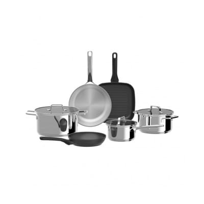 This set contains a mix of pots and pans made of recycled stainless steel bodies and coated recycled aluminium bodies. The saucepan, 20 cm and 24 cm casseroles and 24 cm frying pan are all made from recycled stainless steel with a stylish satin finish. The capsule base distributes heat quickly and evenly over the entire surface on any kind of cooktop, including induction. The clear glass lids of the saucepan and casseroles have a stainless steel rim and an integrated steam vent to help you monitor the contents. All these items are dishwasher safe. The 20 cm non-stick frying pan and the 24 cm non-stick grill pan are made of recycled aluminium and have a ceramic and healthy CeraGreen coating that allows you to cook with little or no oil. The coating makes these pans easy to clean, but they are not dishwasher safe.
