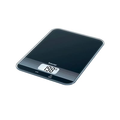 The Beurer KS 19 Black Kitchen Scale with tare weighing function and fine weight graduation in elegant black looks good in any kitchen.