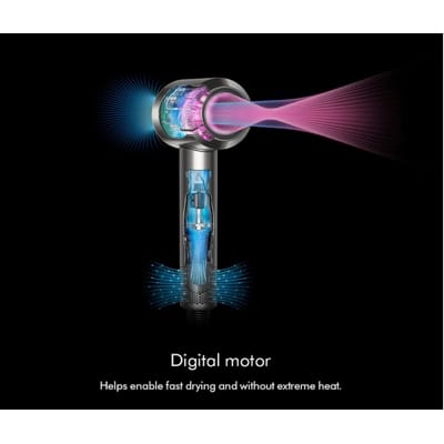 Supersonic by name, supersonic by nature. This Dyson hair dryer’s Dyson digital Motor V9 with Air Multiplier technology produces a high speed jet of air to dry your hair in double-quick time. You won’t have to worry about heat damage though. The intelligent heat control measures the temperature 40 times a second to help protect your locks and keep them fabulously shiny. And with four precise heat settings ranging from 28 to 100°C, you can lock in your perfect salon-worthy look just the way you like it.