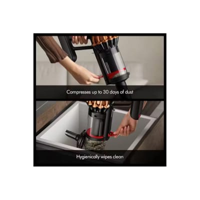 Dyson’s CleanCompaktor bin compresses dust and debris to hold 30 days. When you empty, the bin is wiped clean. No dust or tangled hair is left behind.