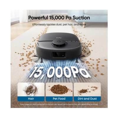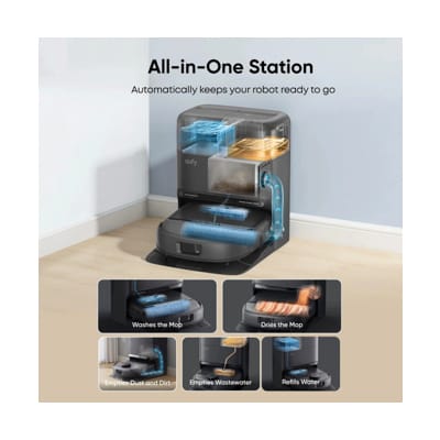 Eufy Robot Vacuum Omni C28 is a self-cleaning mop and tangle free suction vacuum with 5-in-1 base station. Enjoy truly hands-free cleaning with a docking station that automatically handles dust emptying, mop washing, water refilling, hot-air drying, and wastewater collection.