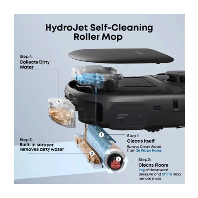 HydroJet Self-Cleaning Roller Mop: Roller mop cleans itself in real-time and scrubs with 1 kg of downward pressure to deliver spotless, streak-free floors.