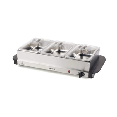 - Great for family meals, dinner parties and catering, the 4.5 L Progress Three Pan Buffet Server keeps food warm for up to three hours.
