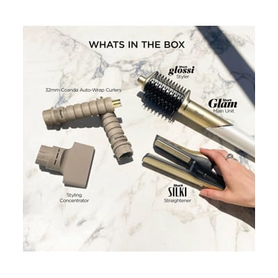 Finished in a luxurious gold colour, the Shark Glam Multi-Styler is as stylish as it is functional. It includes everything you need: Hair Dryer, Styling Concentrator, Auto-Wrap Curlers, Silki Tool, and Glossi Tool.
