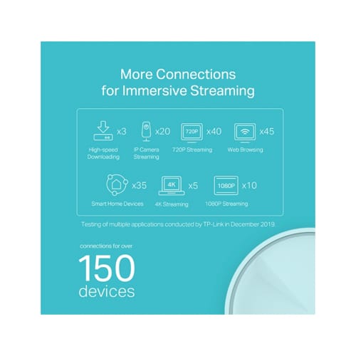 Enjoy a more efficient network with 4× the average throughput on connected devices in dense environments thanks to Wi-Fi 6 technology. Deco X20 is tested to connect over 150 devices without dragging down performance.