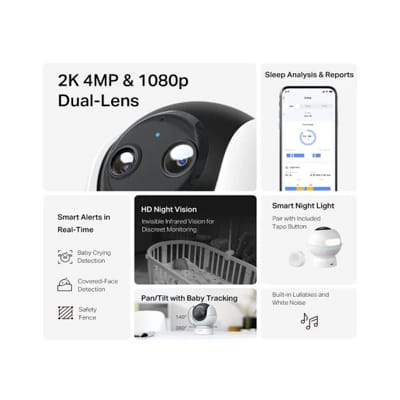 Keep an eye on your baby anytime with the TP-Link Tapo C840 Dual-Lens Smart Baby Camera. Enjoy 2K clarity, AI motion alerts, two-way audio & night vision.
